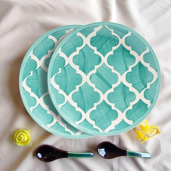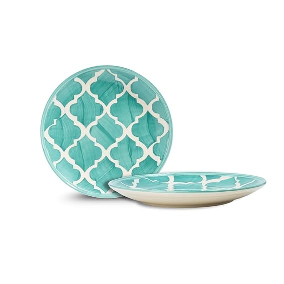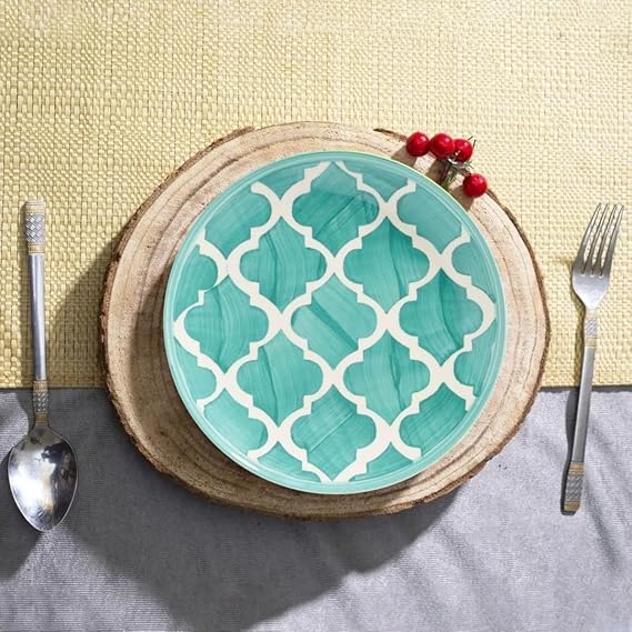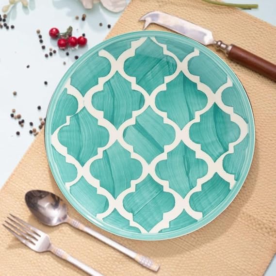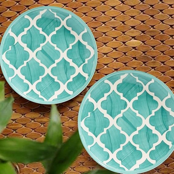 Elevate your dining aesthetic with our Aqua Lattice Ceramic Plates – a stunning set of 2 crafted for modern tables. The soothing turquoise base and elegant white pattern make them perfect for serving snacks, desserts, or side dishes.