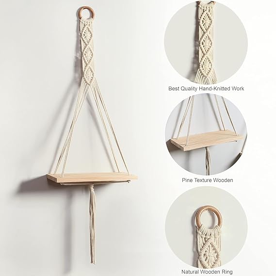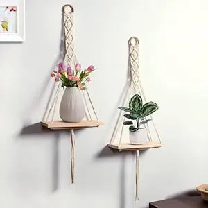Add a bohemian vibe to your walls with this Macramé Wall Hanging Plant Shelf Set. Hand-knotted with cotton cords and paired with minimalist wooden planks, these hangers are perfect for displaying small planters, succulents, or decorative items.