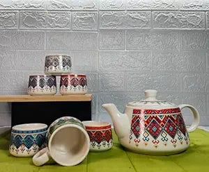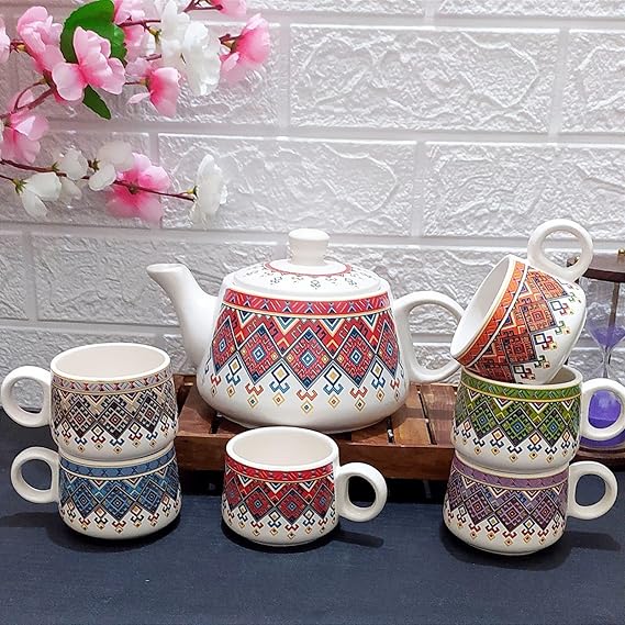 Boho Print Ceramic Kettle Set with 6 Matching Cups – Multicolor