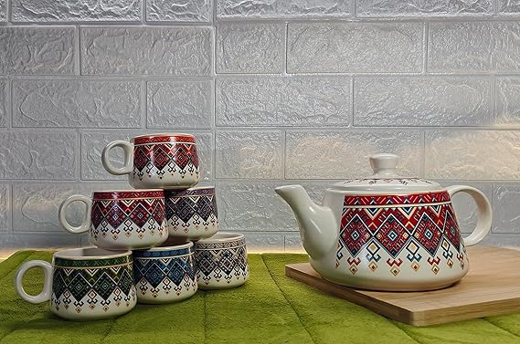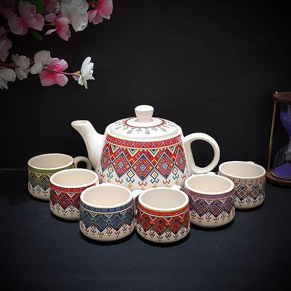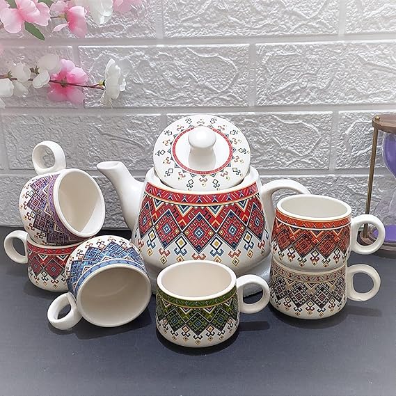 Elevate your tea-time with this Boho Print Ceramic Kettle Set, featuring vibrant ethnic patterns and six coordinated multicolor cups. Handcrafted to bring joy to your gatherings, this set combines functionality with eye-catching design – a perfect blend of tradition and modern living.