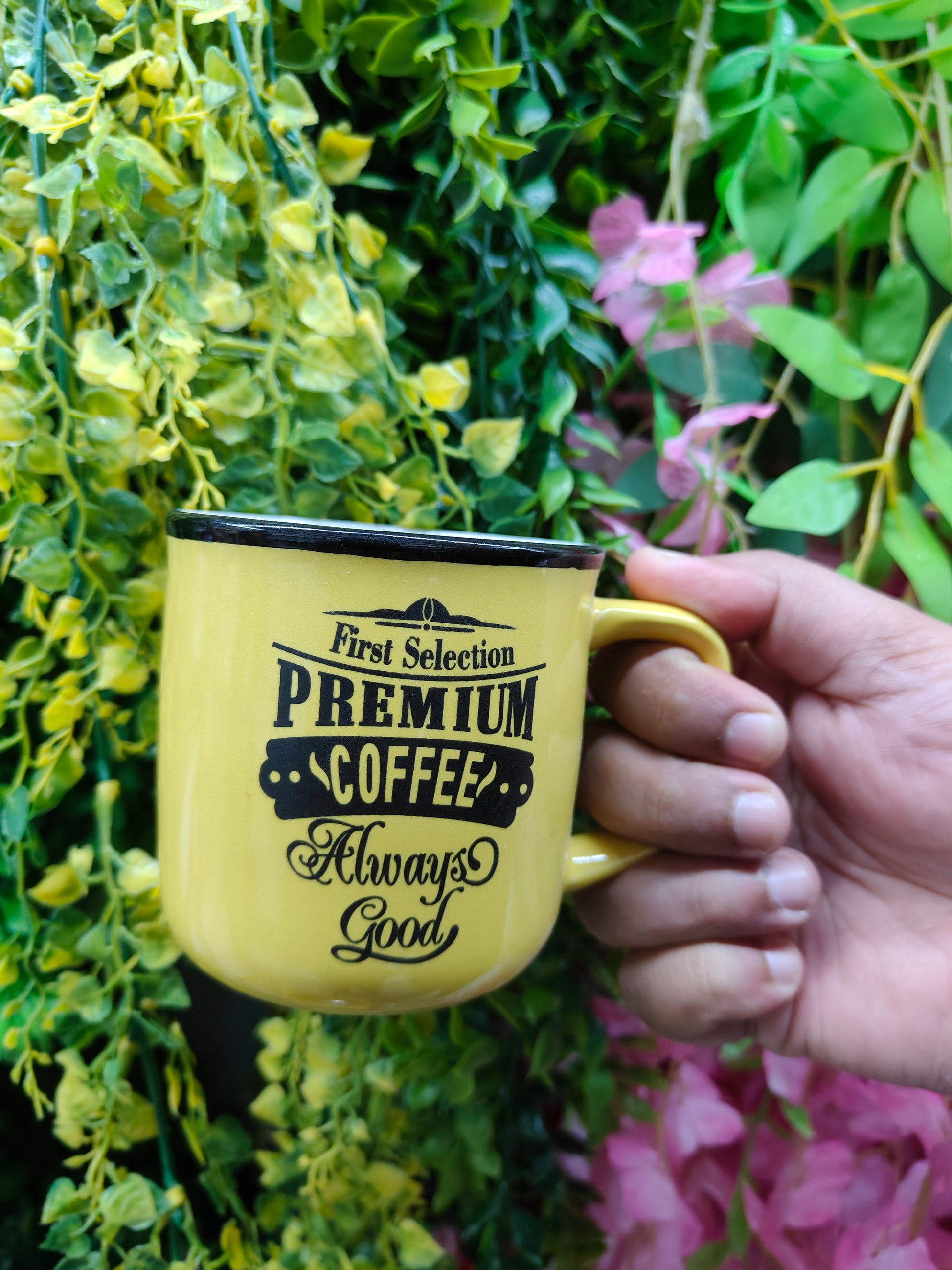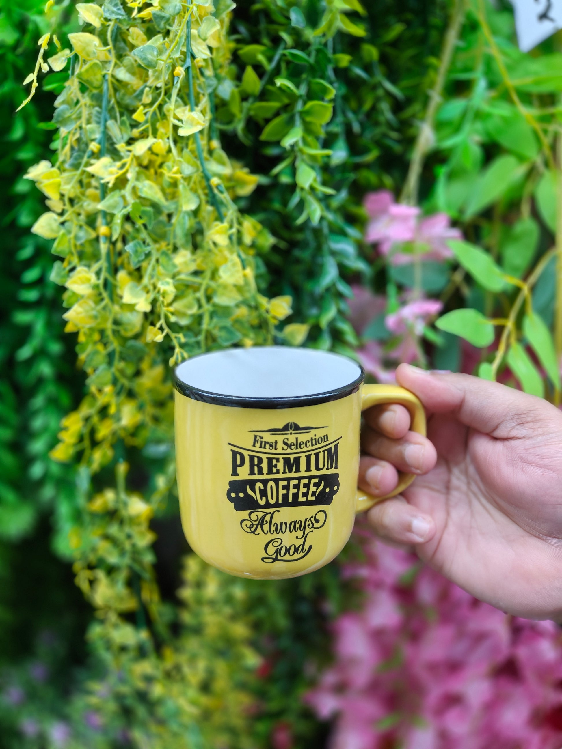 Start your day the right way with our Premium Coffee Mug. Featuring a bold yellow finish and retro café-style typography that reads "First Selection Premium Coffee – Always Good", this mug is the perfect mood-lifter for your morning brew.