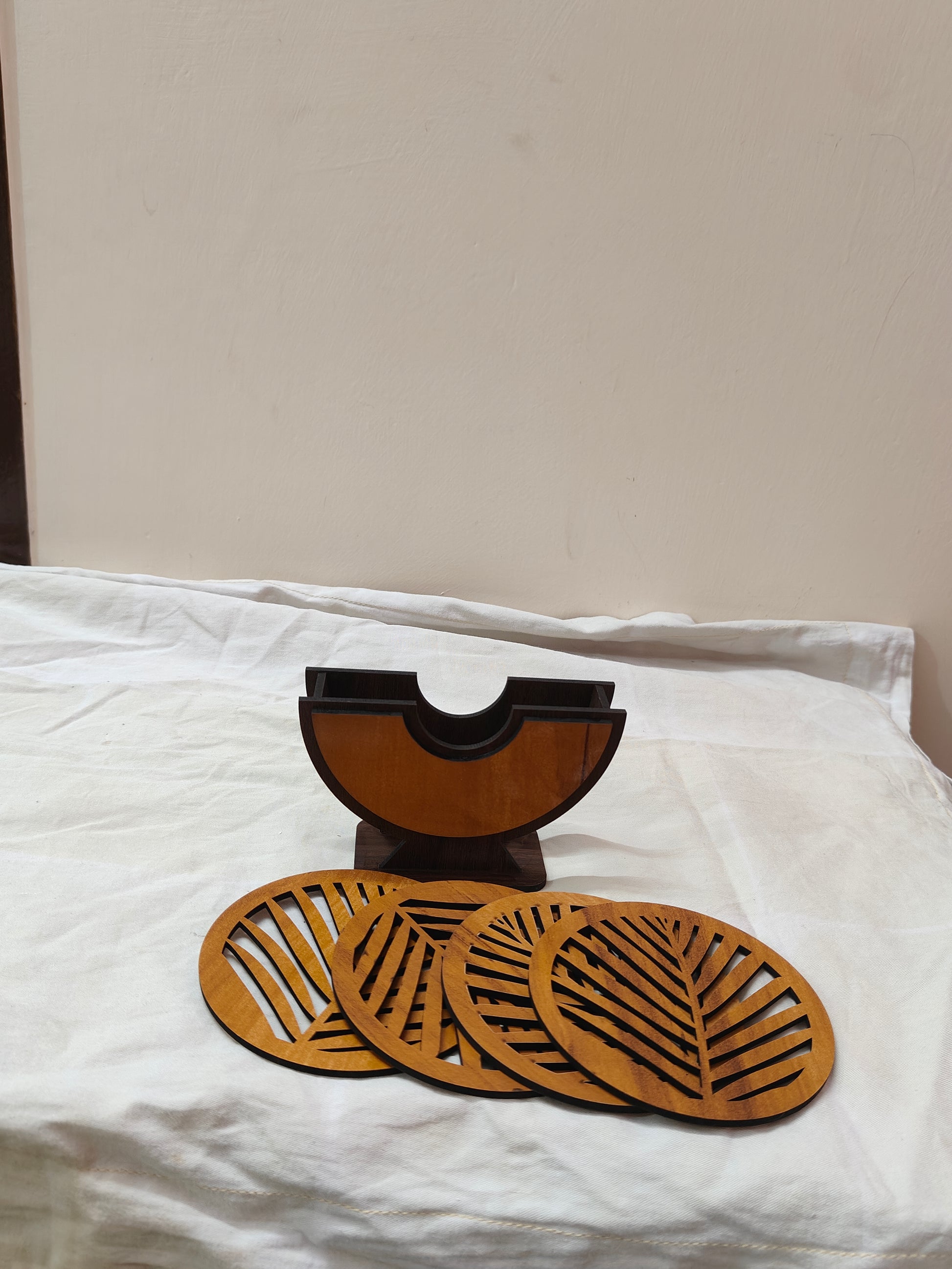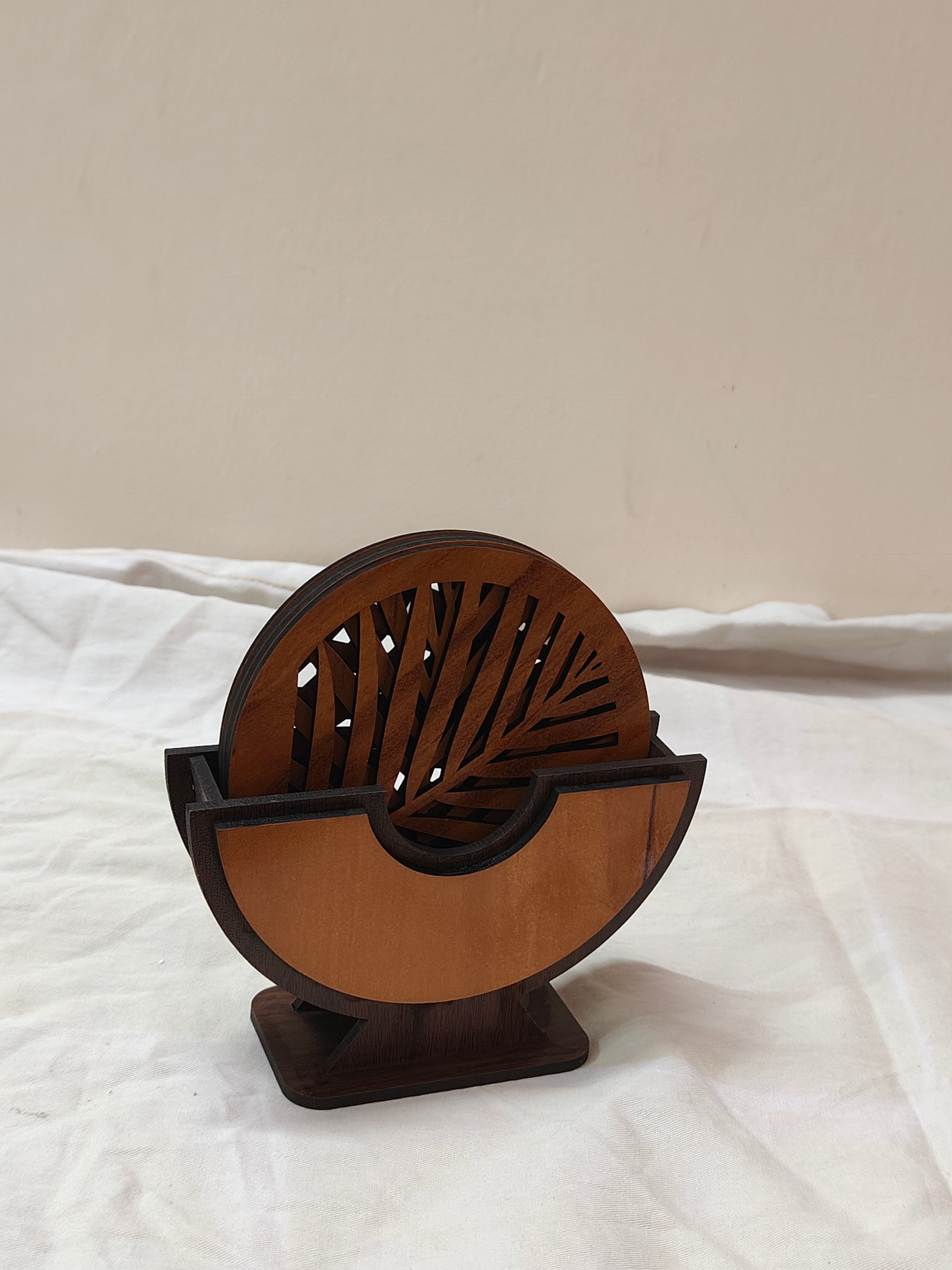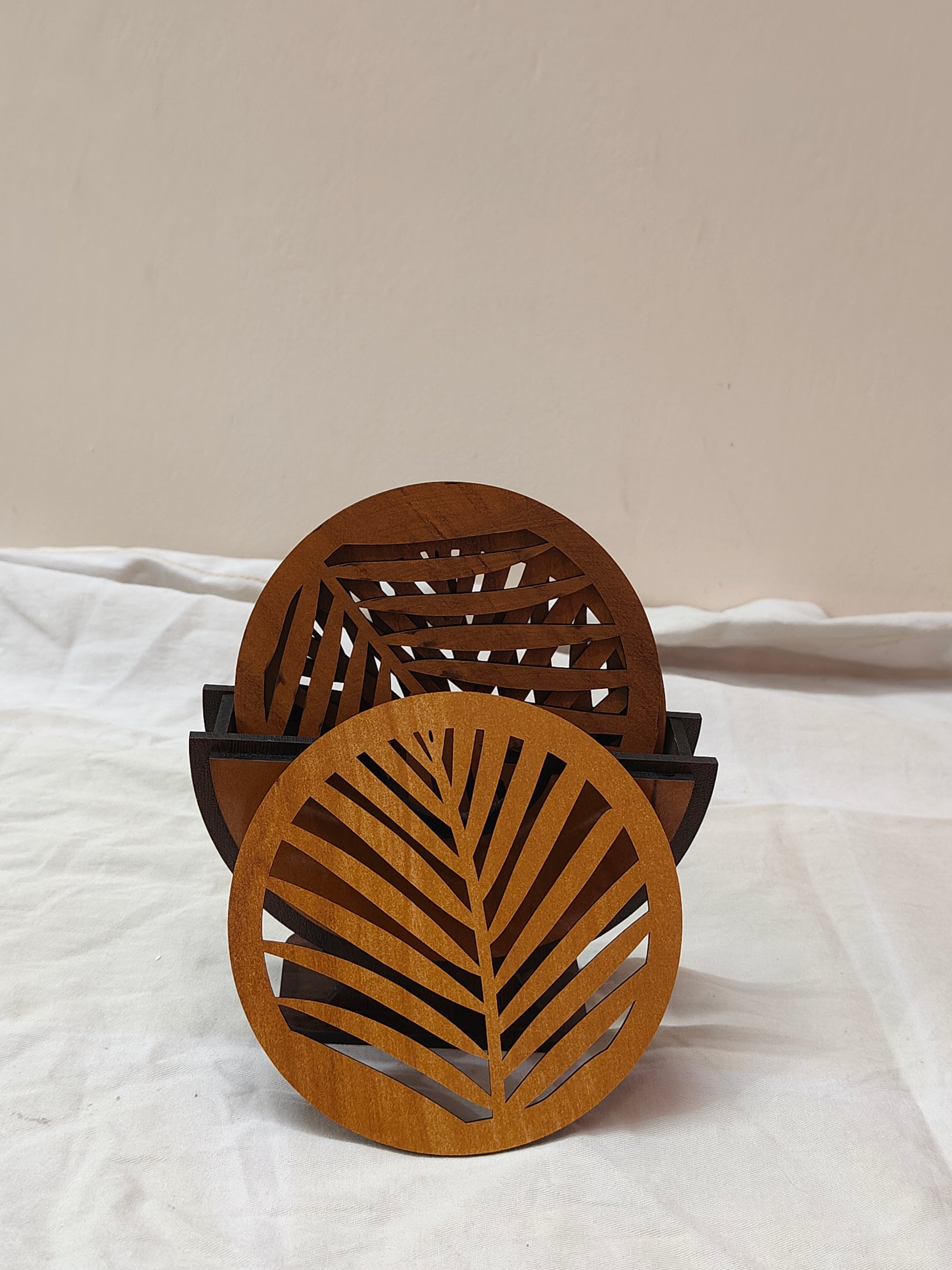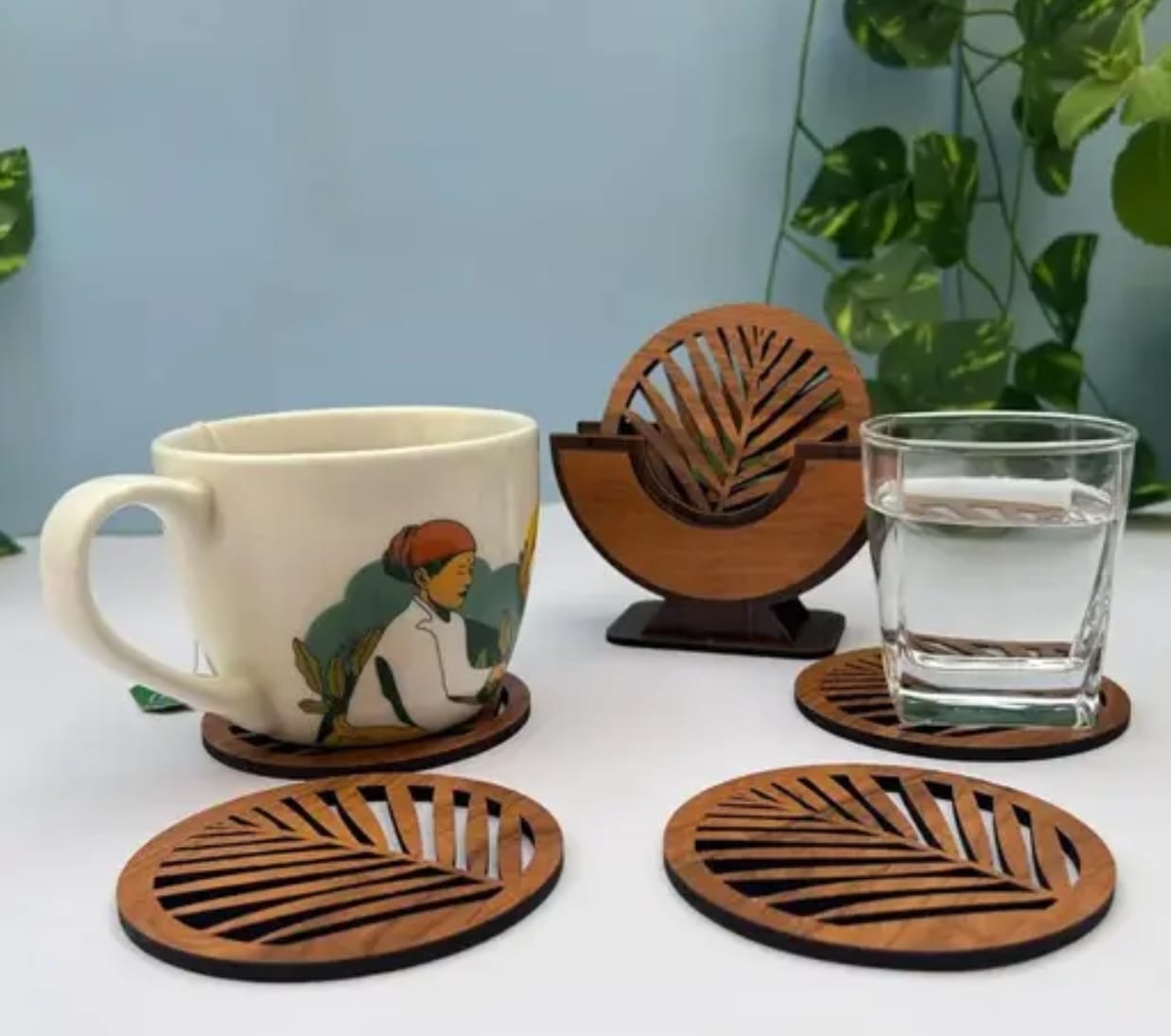 Premium Wooden Leaf Cut Coaster Set – Set of 4 with Stand