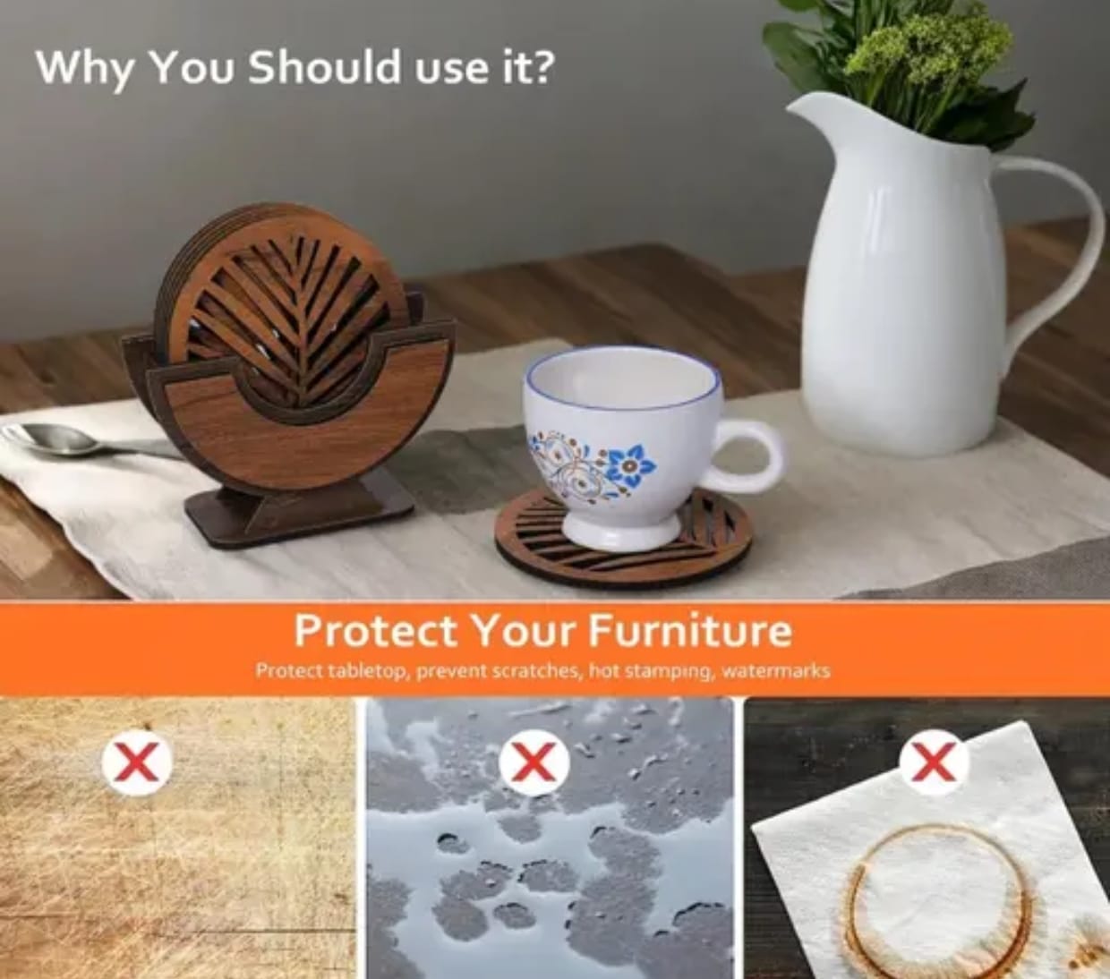 Style meets functionality with our handcrafted Wooden Coaster Set, featuring intricate tropical leaf cutwork designs. Whether you're sipping chai or serving cocktails, these coasters keep your surfaces protected — and your table effortlessly elegant.